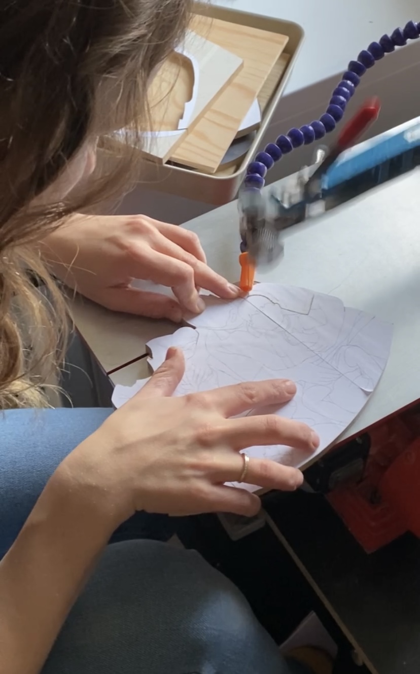 Mit einer Dekupiersäge säge ich entlang aller Linien, sodass aus dem Portrait in Summe eine Art Holzpuzzle entsteht. Einige Teile sind dabei nicht einmal stecknadelgroß.